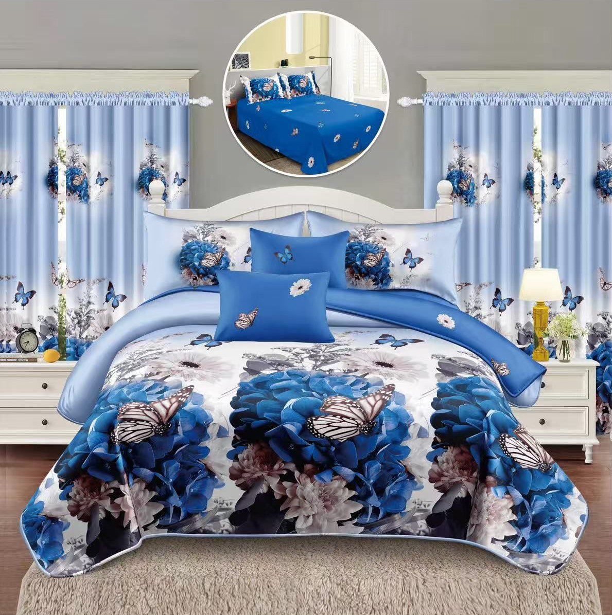 Lenjerie Bumbac Finet, Pat Dublu, 8 Piese, 2 Draperii Incluse, Alb, Albastru, Fluturi, Flori