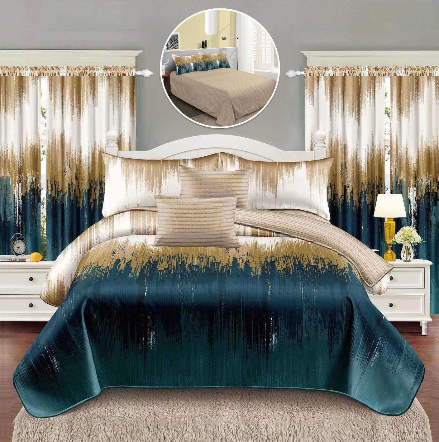 Lenjerie Bumbac Finet, Pat Dublu, 8 Piese, 2 Draperii Incluse, Verde-Albăstrui, Bej