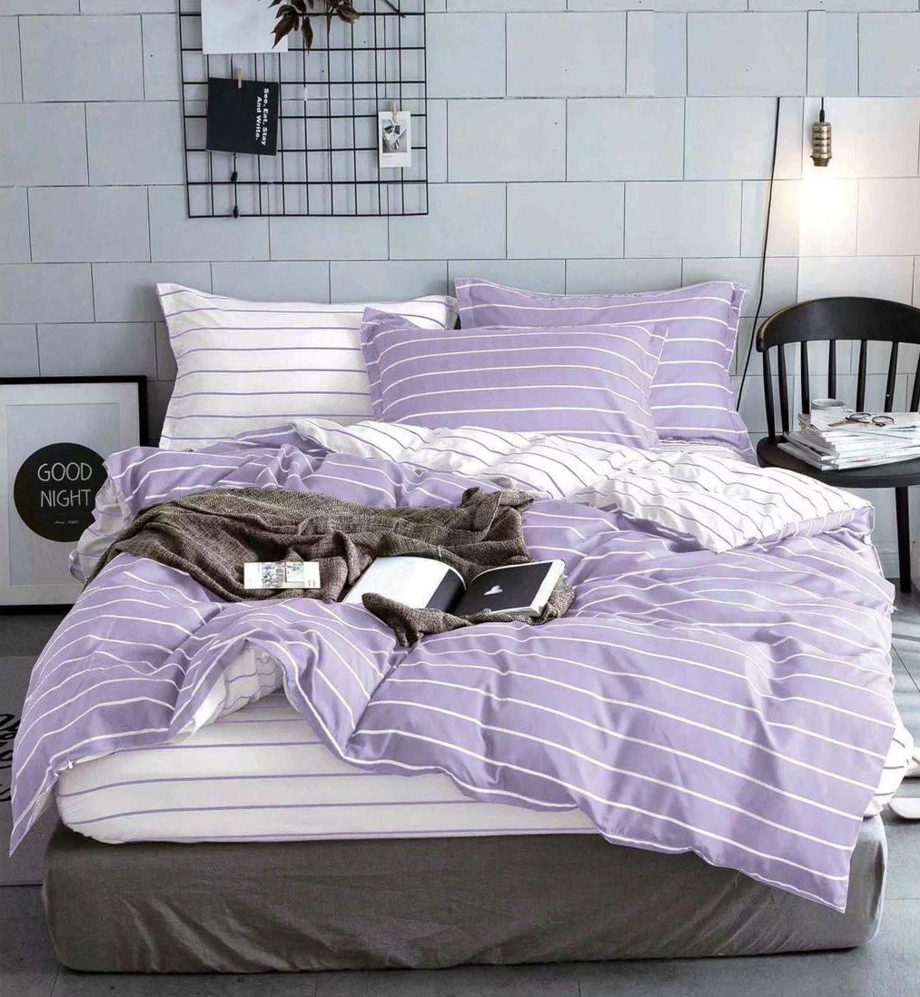 Lenjerie Bumbac Satinat, 4 Piese, cu 2 fețe, Pat Dublu, Lila, Dungi