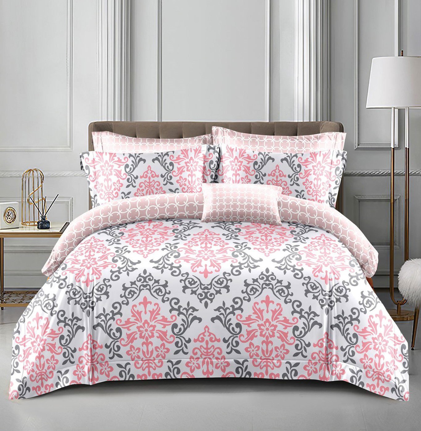 Lenjerie Lux Jacquard, 7 Piese, Pat Dublu, cu Elastic, cu Pilotă, Gri