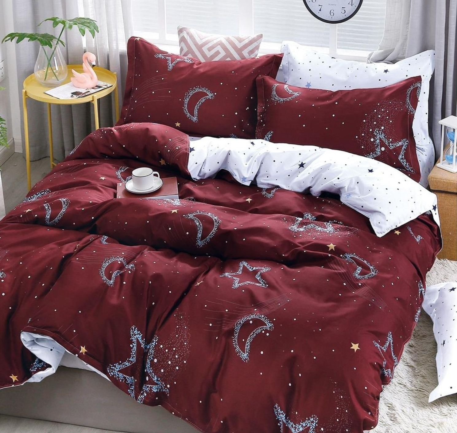 Lenjerie Bumbac Satinat, 4 Piese, cu 2 fețe, Pat Dublu, Grena, Stele, Lună