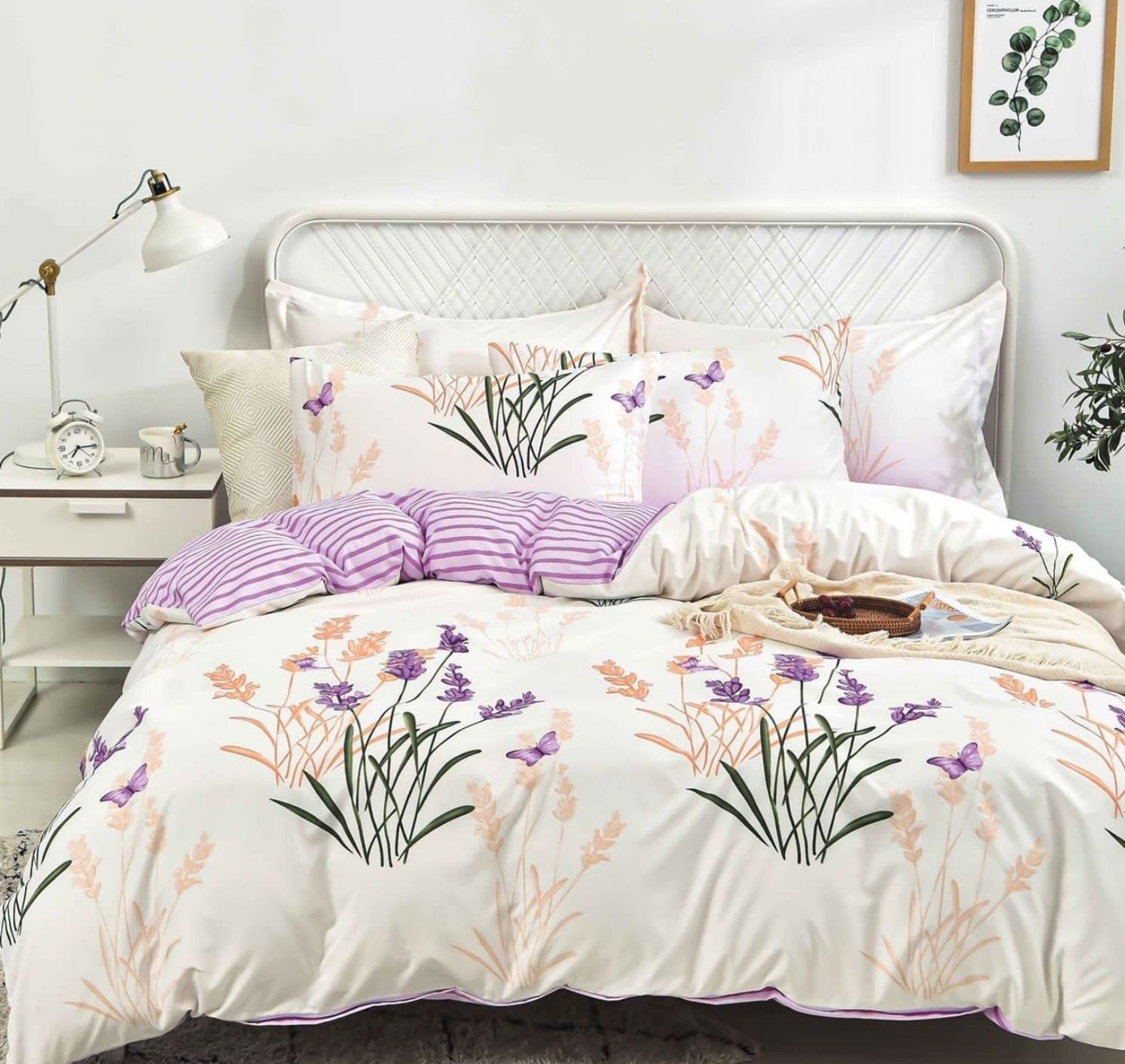 Lenjerie Bumbac Satinat, 4 Piese, cu 2 fețe, Pat Dublu, Crem, Mov, Flori