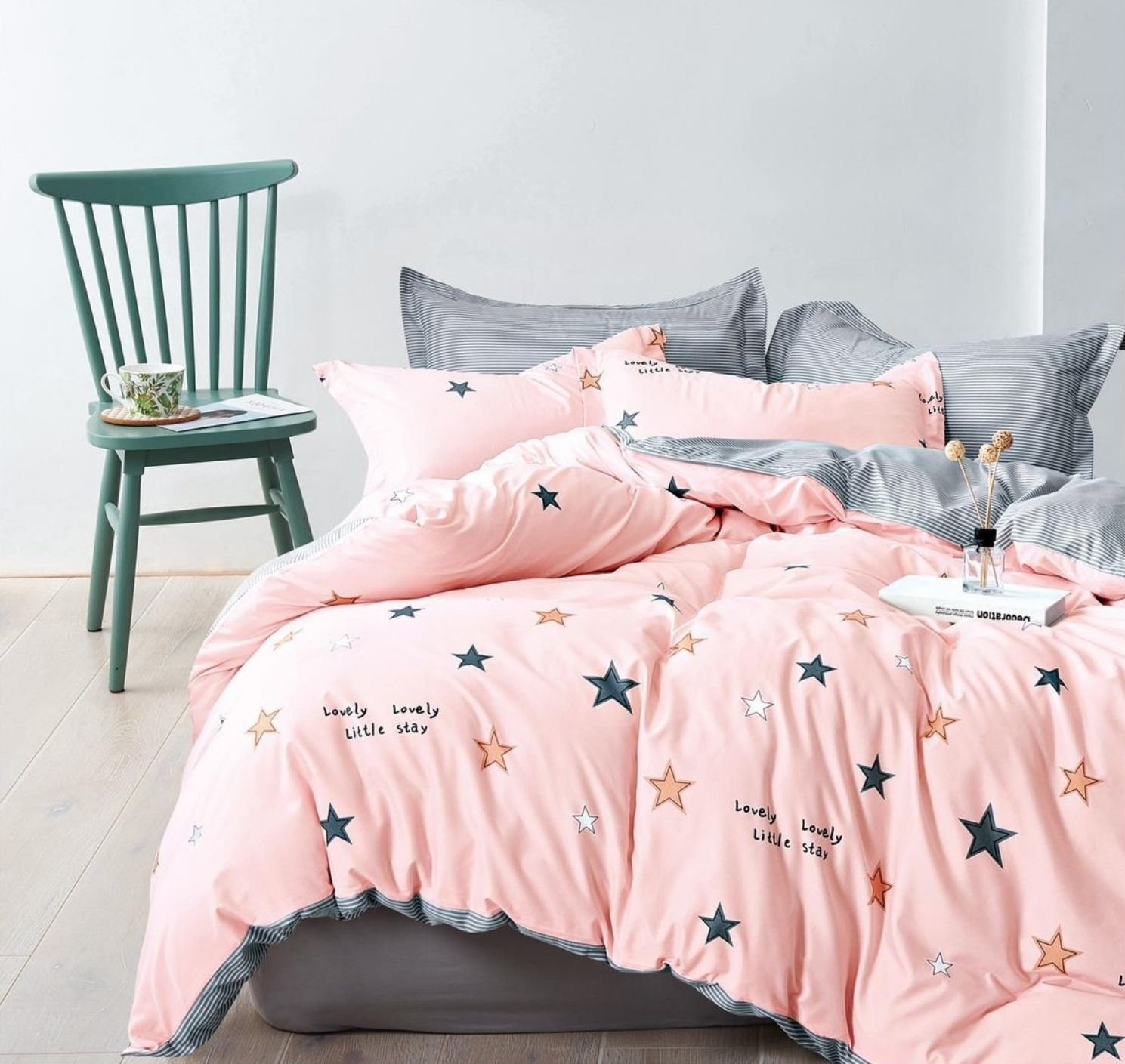 Lenjerie Bumbac Satinat, Cearceaf cu Elastic, 4 Piese, cu 2 fețe, Pat Dublu, Roz, Gri, Stele