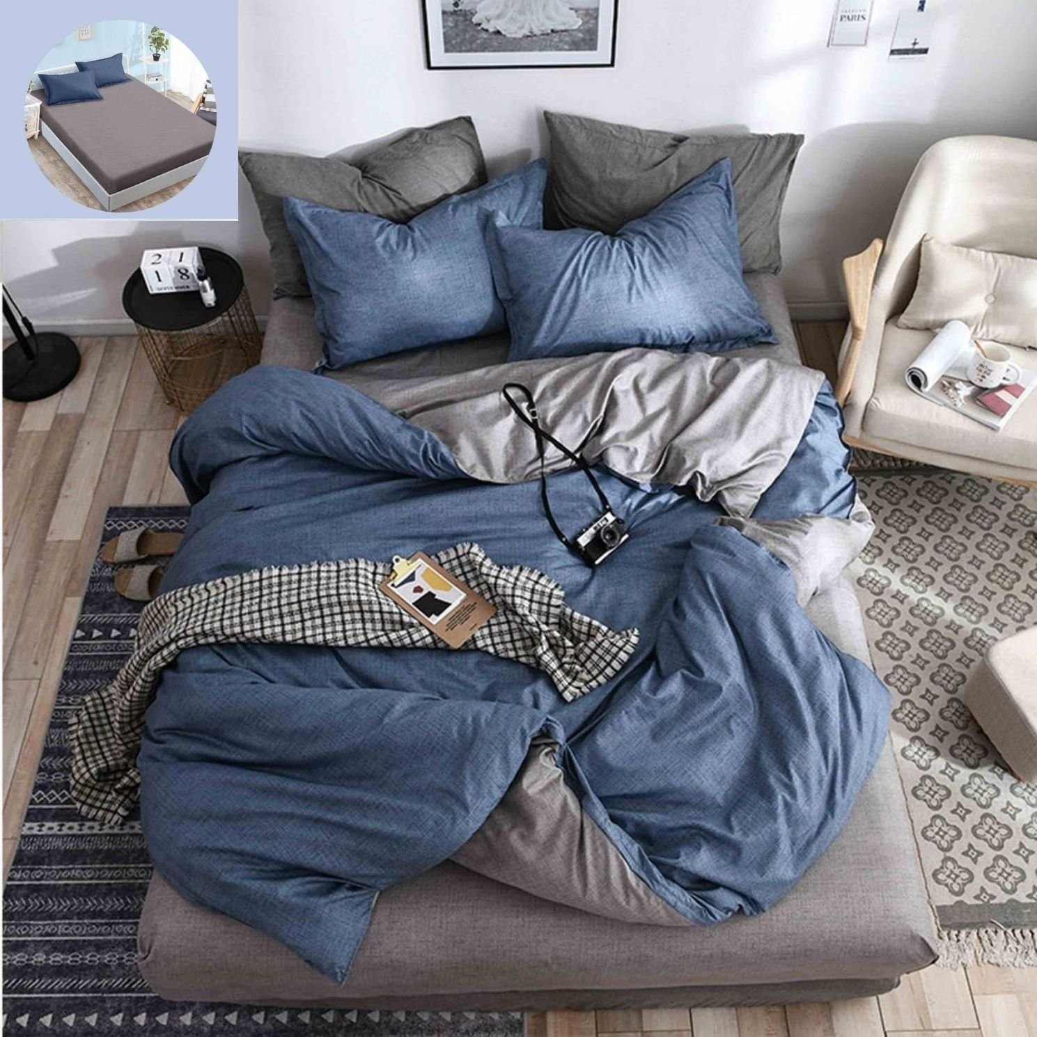 Lenjerie Bumbac Satinat, cu Elastic, 4 Piese, Pat 1 Persoană, Gri-Albastru