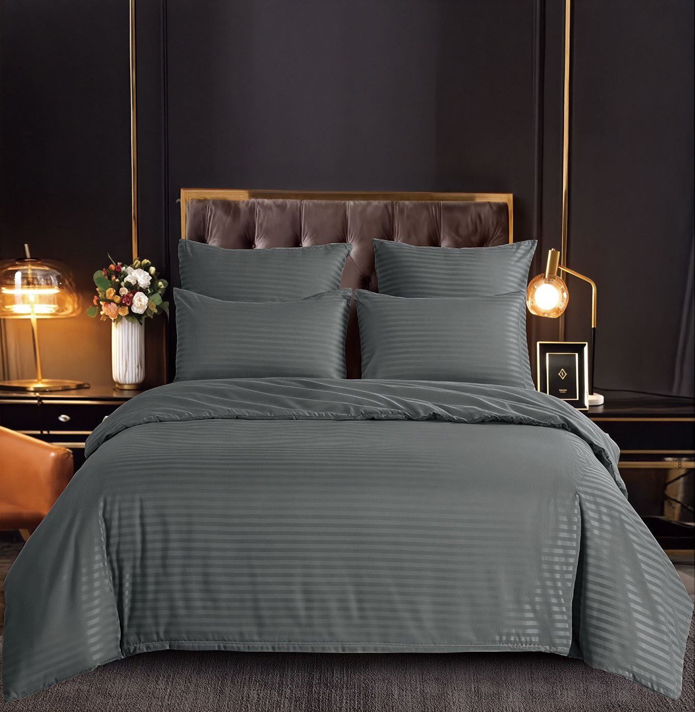 Lenjerie Damasc, Cearceaf Clasic, fără Elastic, 6 Piese, Pat Dublu, Gri Închis
