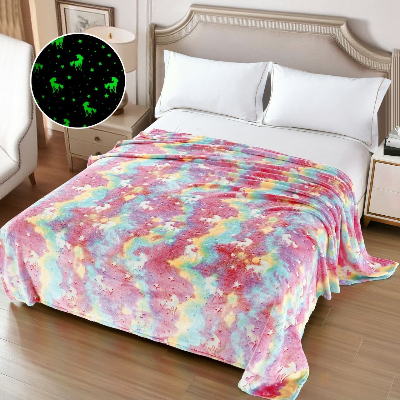 Pătură Cocolino, Model Fosforescent, Unicorni, Pat Dublu, 200×230 cm, Roz