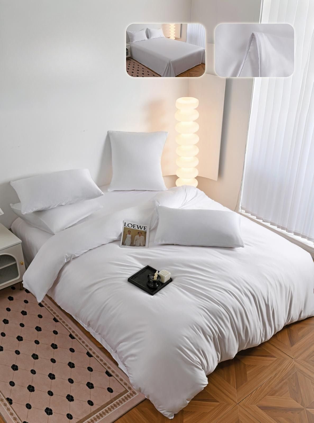 Set Lenjerie de pat, tip Mătase, 6 Piese, Pat Dublu, Alb