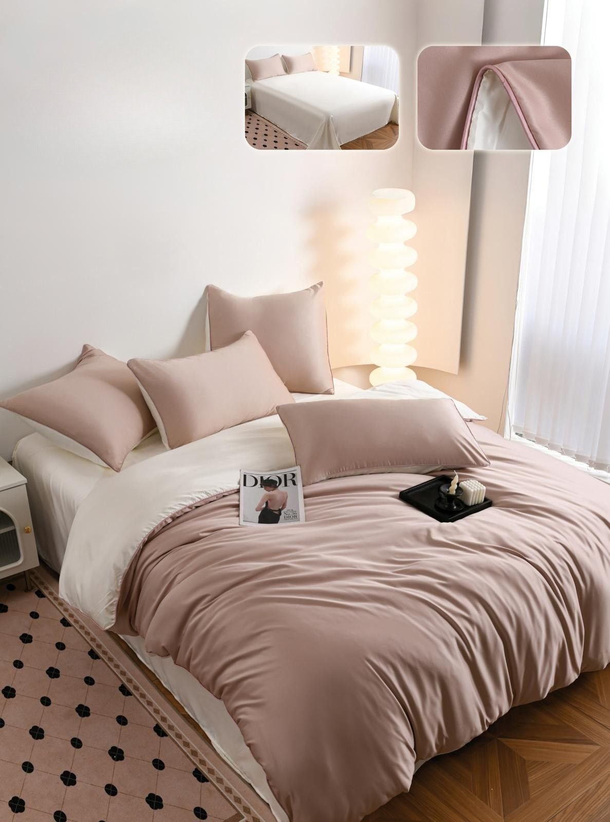 Set Lenjerie de pat, tip Mătase, 6 Piese, Pat Dublu, Roz/Crem